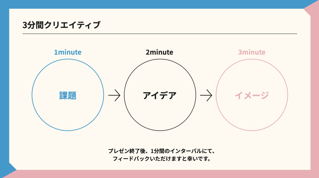 「3 Minutes Creative」では、各社さまに対して「仮説に基づいた課題・視点」「課題に対するアイデア」「アイデアを視覚化したモックアップ」をそれぞれ1分ずつ、計3分間でプレゼンテーション。最後に1分間のフィードバックタイムを設けるという構成をとりました。
