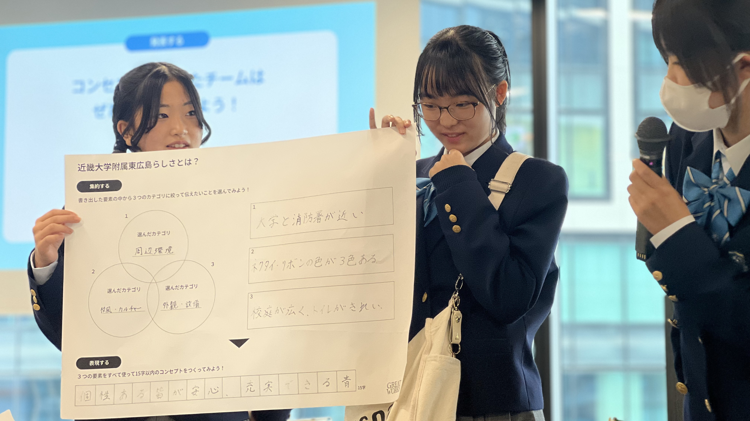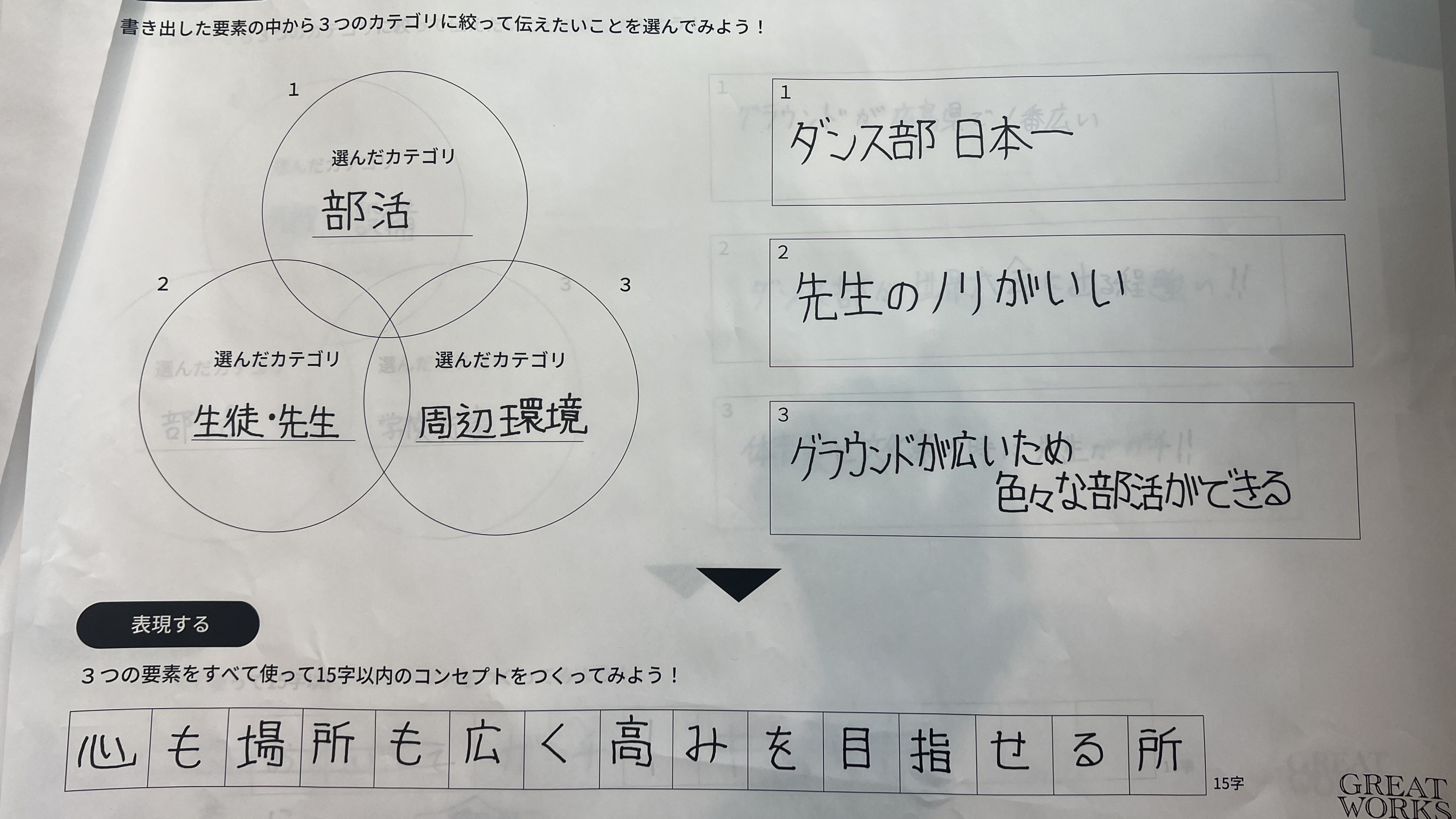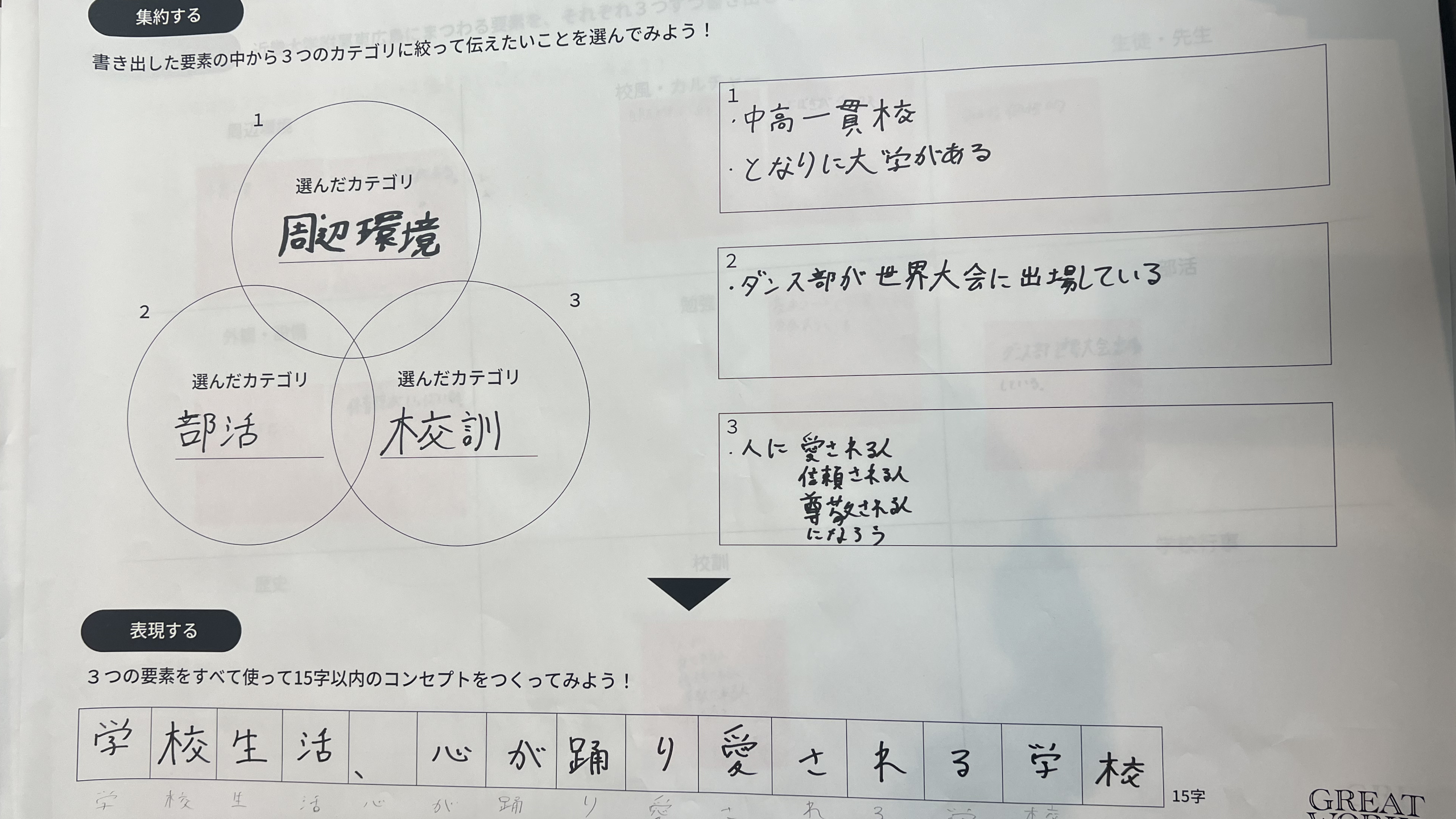 はじめのワークショップでは、自分たちが通っている学校の「らしさ」を、15文字以内のキャッチフレーズに落とし込んでいく過程を体験してもらいました。ここで取り入れたのは、実際のプロジェクトでも活用されている「発散する」「集約する」「表現する」という3つのステップです。まずは、学校にまつわる要素をできるだけ多く書き出します。次に、そこから3つの要素をピックアップ。それらの共通項や意外性について考えながら、最終的にらしさを表す言葉を導いていきます。高尚なものに感じられがちなブランディングの仕事ですが、なるべくシンプルなフレームワークに置き換えることで、子どもたちがチャレンジしやすいかたちに設計しました。
