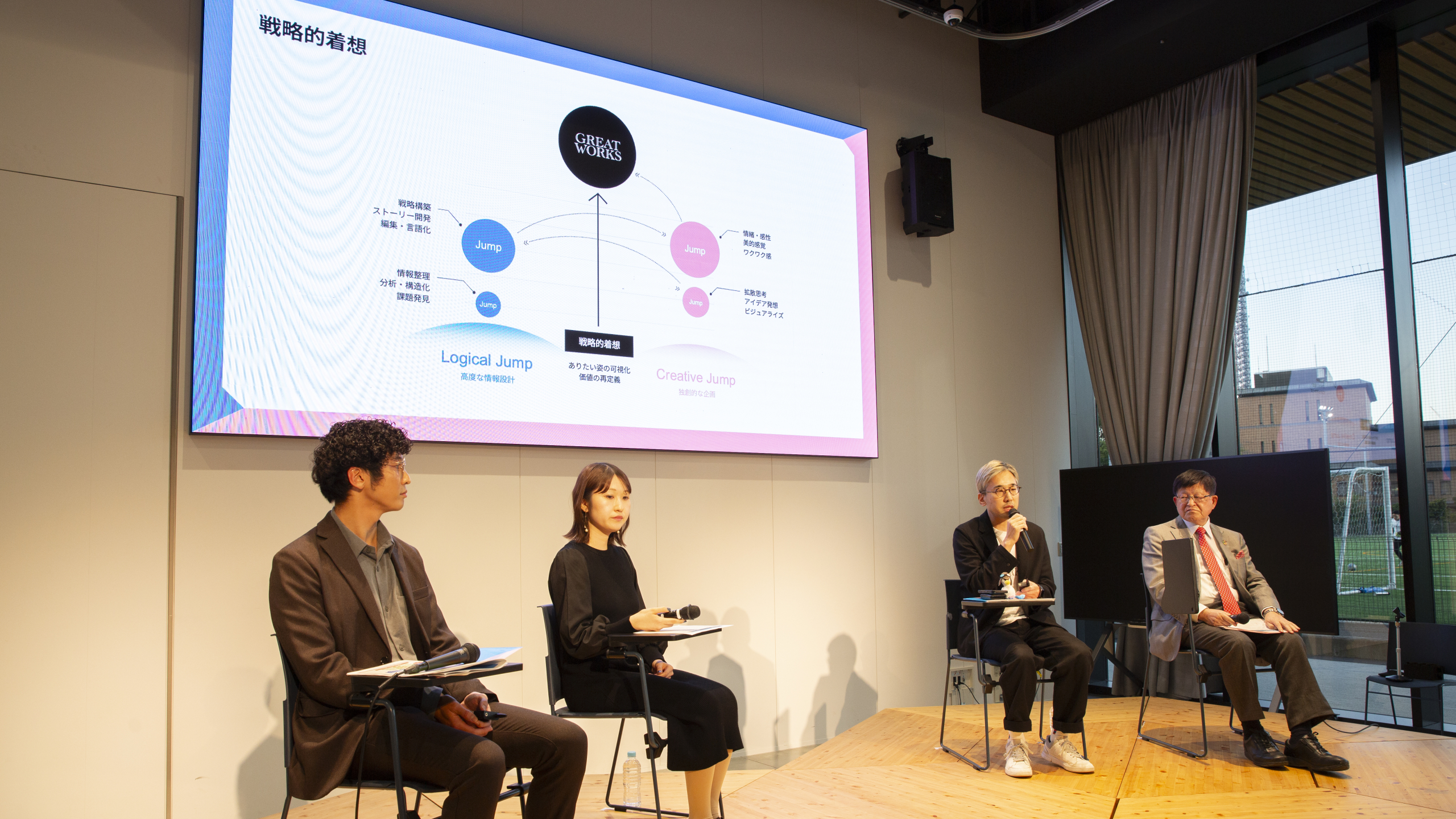 岐阜で創業した刃物メーカー・貝印の子会社であるGREAT WORKSは、東海地域にゆかりのある戦略クリエイティブファームとして、「ビヨンドSDGsにおけるクリエイティブの役割 〜『伝える力』が未来をひらく〜」というテーマのもとセッションを行いました。弊社CEO・山下と顧問を務める笹谷秀光氏の対話を軸に、進行役を担う若手メンバーの根本と岩田の視点も交えながら、トークを展開していきました。